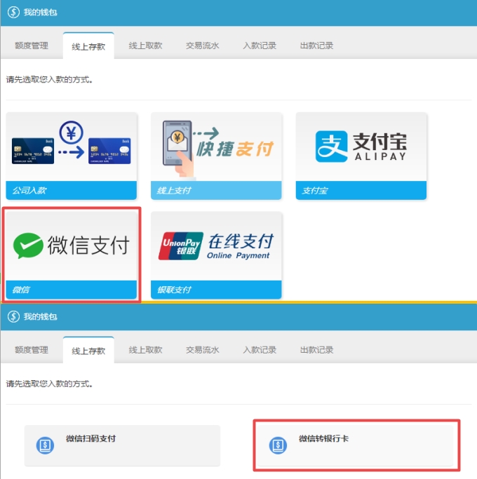 电脑用户点击右上角登入,登入会员账号,点击屏幕右上方的线上存款。再点击微信,选择微信转银行卡