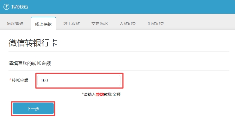查看系统生成带有小数点的金额,记录好公司收款银行账户,使用微信进行转账(转账金额务必与带有小数点的金额一致);到账成功后按照提示填写到账时间,并上传您的转账详情截图,在点击确认提交(温馨提示:使用微信转账至平安银行是即时到账的; 务必先确认到账后,填写准确到账时间,再点击提交,否则财务人员查询不到款项无法第一时间帮您添加额度。)